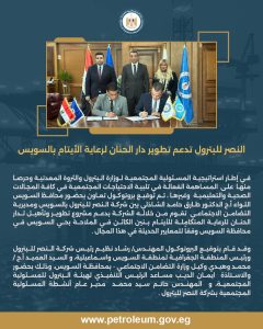 في إطار استراتيجية المسئولية المجتمعية لوزارة البترول والثروة المعدنية وحرصا منها على المساهمة الفعالة في تلبية الاحتياجات المجتمعية في كافة المجالات الصحية والتعليمية وغيرها ، تم توقيع بروتوكول تعاون بحضور محافظ السويس اللواء أ.ح الدكتور طارق حامد الشاذلي بين شركة النصر للبترول بالسويس ومديرية التضامن الاجتماعي تقوم من خلاله الشركة بدعم مشروع تطوير وتأهيل لدار الحنان للرعاية المتكاملة للأيتام بنين الكائن في الملاحة بحي السويس في محافظة السويس وفقاً للمعايير الحديثة في هذا المجال .