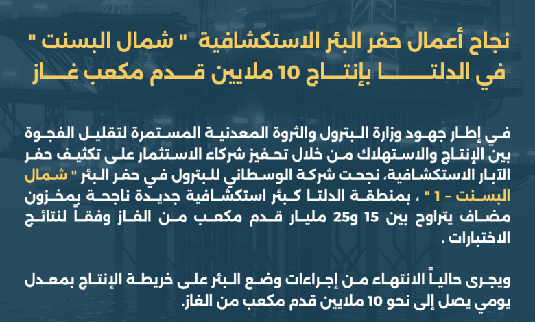 في إطار جهود وزارة البترول والثروة المعدنية المستمرة لتقليل الفجوة بين الإنتاج والاستهلاك من خلال تحفيز شركاء الاستثمار على تكثيف حفر الآبار الاستكشافية، نجحت شركة الوسطاني للبترول في حفر البئر ” شمال البسنت – 1″، بمنطقة الدلتا كبئر استكشافية جديدة ناجحة بمخزون مضاف يتراوح بين 15 و25 مليار قدم مكعب من الغاز وفقاً لنتائج الاختبارات .